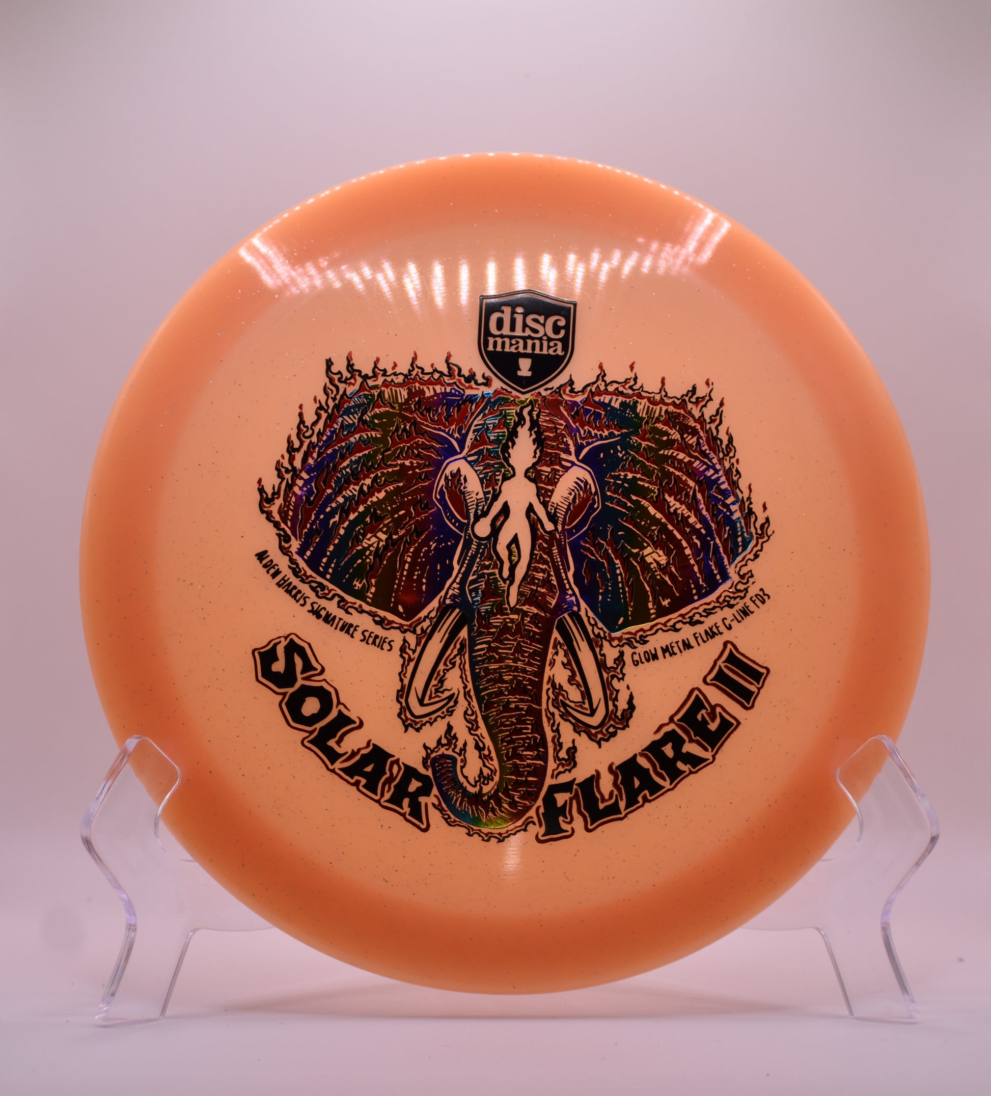 Unleash the heat with the Solar Flare 2, the second iteration in Alden Harris’ Signature Series— and it’s hotter than ever. This signature series FD3 combines the power of Discmania’s most trusted overstable fairway driver with the eye-catching brilliance of Glow Metal Flake C-Line plastic, offering unmatched durability, grip, and visibility in low-light conditions.
